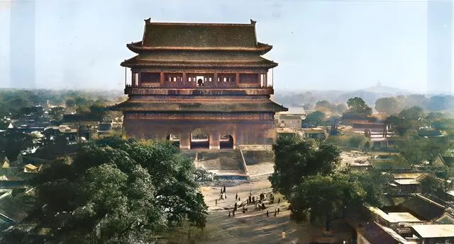 这个高大的城楼叫鼓楼,青砖红墙压着黑瓦,檐角挑得利落,城楼下人影细小一串串地往来,像在一口巨鼓边走过,老辈人说,鼓一响就是城里作息的节拍,现在城市里是手机滴滴一震,节拍全在手心里了。