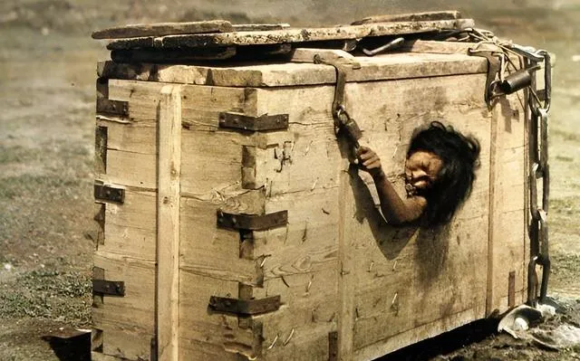 这个木箱叫饿刑箱,粗钉乱钉的板条外漏着铁箍,女子的头和一只手从缺口里探出,抓锁头抓得发青,不喝不吃只受风吹日晒,光看就憋得慌,奶奶摇头说,活人被当死物关着,这才叫寒心。