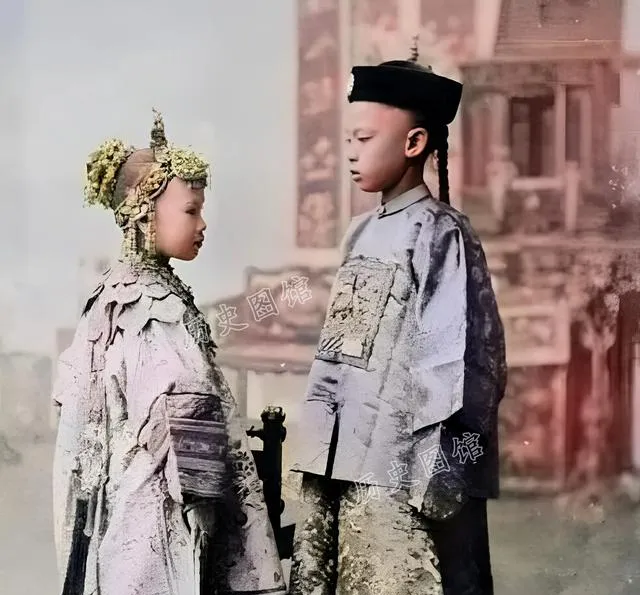 这张是童婚合影,男孩身前的补子看得清,女孩头面压得沉,金串叮叮,两个小脸对着,像要背词一样紧张,外婆说那会儿有契书就算成婚,至于懂不懂过日子,没人问。