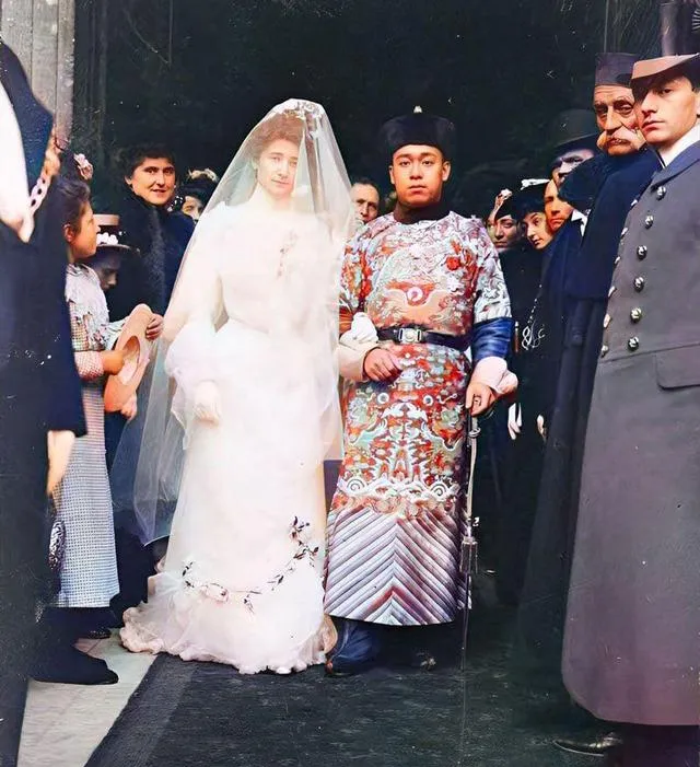 这一对是跨国婚礼,新娘白纱如雾,新郎蟒袍纹样鲜亮,门口人头攒动,大家都探着身子看,现场的热闹透着好奇心,放在现在,这样的组合不过是一句祝福就过去了。