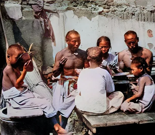这家的桌子是门板架的,孩子坐水缸上当凳,男人赤膊吃得香,碗边溅着汤点子,虽说家境寒,围坐一圈就有热气,想起小时候夏天院里支张木桌,打着团扇吃面,汗珠子掉碗里也不嫌。
