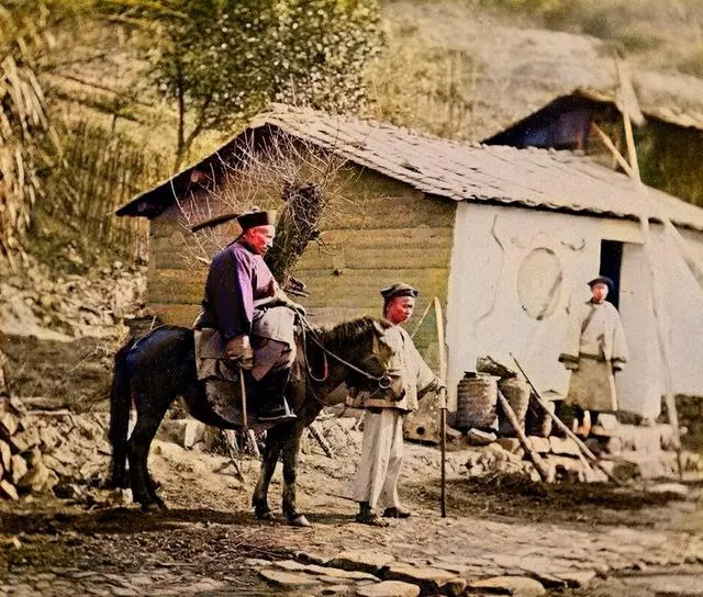 图中这位是边防武官,人一手缰绳一手马鞭,随从牵着马,刀鞘在腿边磕来磕去,坡地上石子多,走一步响一下,老伯说,骑巡也累,山里风大,衣角打脸疼。