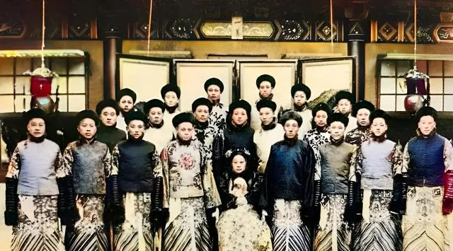 这三个小丫头穿的叫旗装,宽袖直领,发间插着银坠子,坐中间的戴头花最细致,耳坠轻轻晃,左边那孩子脚背鼓鼓的,裹脚裹得紧,右边的站得笔直,手里折扇不离,小人儿身上就分了贫富与规矩。