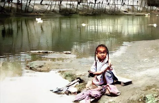 这张最扎心,孩子蹲在河沿洗衣服,衣裳破开口子,岸上风一吹他就缩脖子,妈妈说以前水边就像家里的盆,衣食住行都靠它。