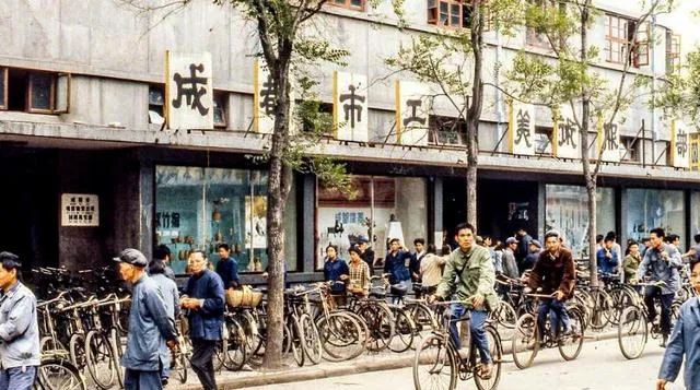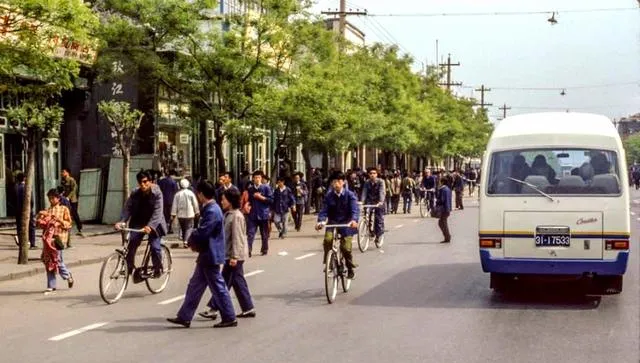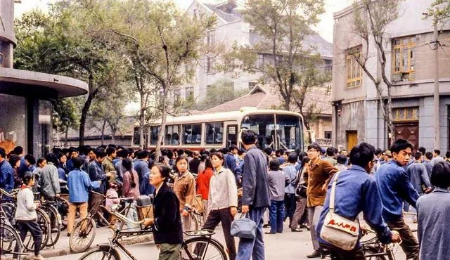 图中这阵势叫上下班高峰,路上清一色蓝灰外套,身旁挤满了二八大杠,公交挤不上去就踩车,铃声一路叮当,拐弯得伸手打个招呼才算规矩,那个年代堵车少,但人情味儿多。