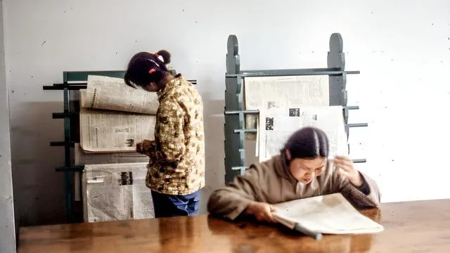 图中木架子叫报夹,报纸从上往下套在竹条上,翻一页“哗啦”一响,指尖蹭着铅油味儿,姐姐低着头抄标题,遇到生词用铅笔点个圈,回家给我讲半天。