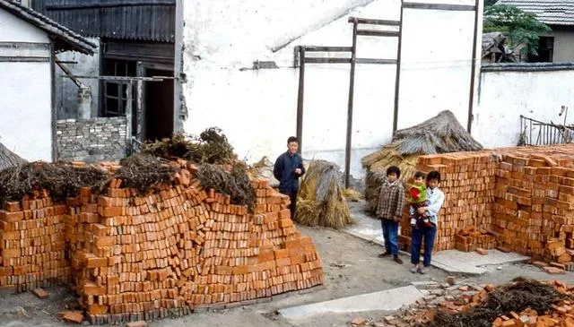 图中红砖码得齐,叫备料起屋,砖缝里塞着秫秸保干,角上压着破瓦片防雨,叔叔拿粉线一弹,白印子贴着地面一条直,抬头说再攒两月工分,屋梁就能上。