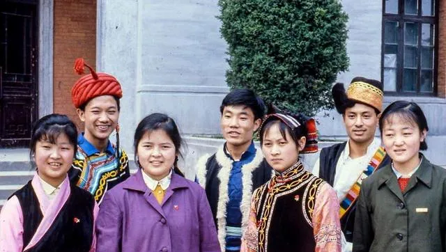 图中衣裳各不相同,叫民族盛装,绣片、银饰、流苏在阳光下亮一亮,大家站在教学楼前,神气又庄重,我们那时最爱问这腰带哪儿买的,人家笑说自己做的。