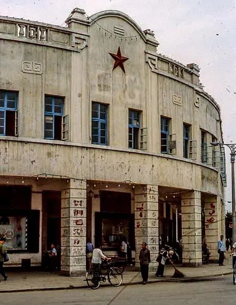 这个老楼叫骑楼,转角处顶着一颗红星,檐下立柱刻着口号,阴雨天走廊不淋雨,店里门帘被风吹得哗啦响,现在商场玻璃亮堂堂,以前就靠这条骑楼撑起一条街。