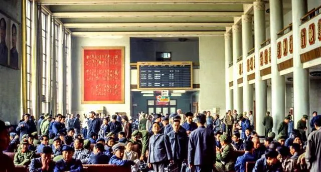 图中人挤人,叫绿皮火车候车,墙上红幕布印着标语,电子牌还不多见,大家提帆布包、铝饭盒、搪瓷缸,广播一响齐刷刷站起来,慢是慢,慢下来的团圆更香。