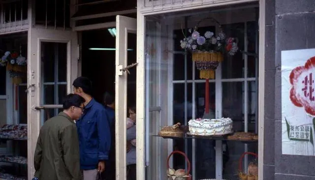图中白色圆盒叫奶油蛋糕,玻璃窗上挂着纸花篮,过生日才舍得买一块,刀子一抹是甜的,手背上不小心蹭了一条白道子,弟弟伸指头偷舔,奶奶抬眼装作没看见。