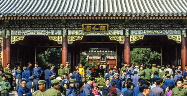 这片空地叫停车场,解放牌、吉普车、旅行团全在这等,远处城墙一层层叠过去,售票亭前红袖章举着喇叭喊队形,风一吹,有人把军大衣扣紧了,准备上山见“好汉”。