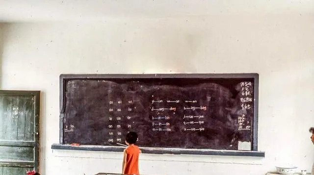 图中粉笔字叫拼音表,aoeiu整整齐齐挂成一排,小男孩被点名到台前领读,声音带着回声,窗外有鸟叫,他还回头瞄了一眼,老师敲敲桌子继续念。
