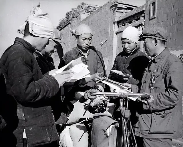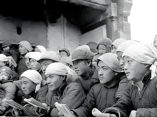 图里人手一本小册子,这就是扫盲课本,纸张发灰却字大清楚,社里晚上点煤油灯,大家围着念,爷爷说认得“米”“面”这俩字,去供销社买东西就不怕糊涂了。
