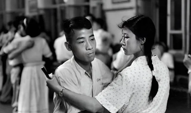 这个场景叫工人俱乐部舞会,男孩袖口挽到小臂,女孩编着辫子贴着拍子走步,动作还有点拘谨,可眼神里亮晶晶的,音乐一响,心就软了半截。