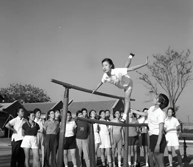 图中女生在高低杠上抬腿成线,老师扶着腰眼,旁边同学“嘘”地吸一口气,那时候的体育课真下力气,鞋底子蹭着木杆,吱呀一声就算成功了一半。