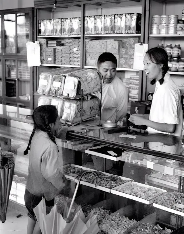 这叫副食柜台,玻璃底下装的是松糕和奶糖,售货员穿白褂子,算盘“嗒嗒”响,小姑娘手里捏着一张粮票加几毛钱,抬头问能不能多给一颗碎糖渣,笑声就来了。