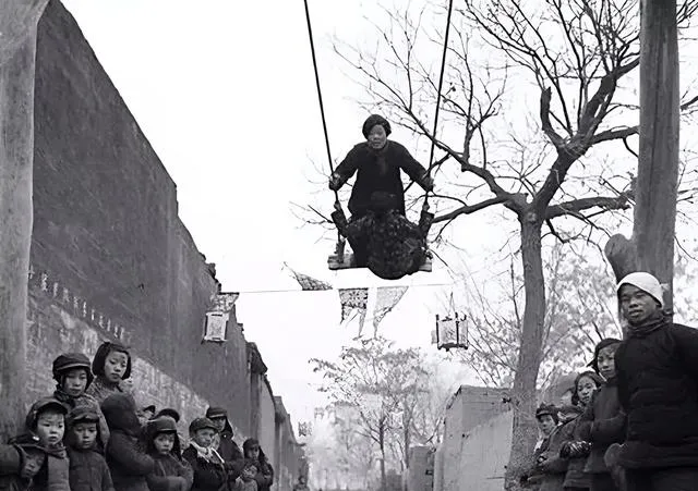 这玩意儿我们那儿叫荡秋千,绳子系在横杆上,逢年过节才搭,女娃子蹬着脚心一狠,越荡越高,旁边孩子咬着手背看得直叫好。