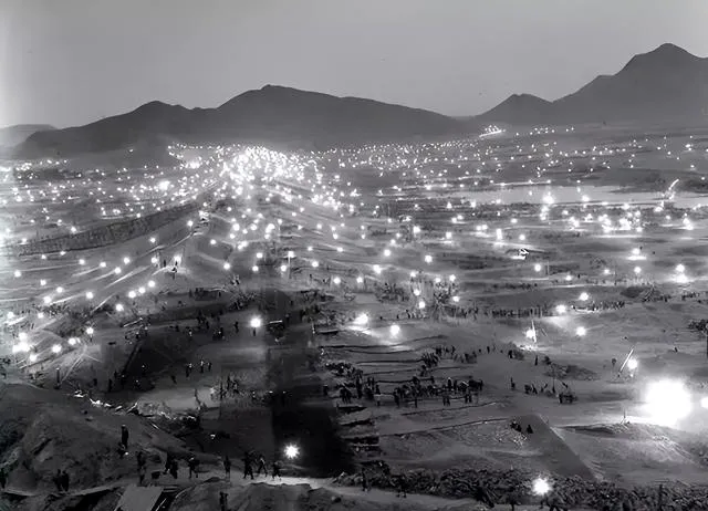 这个灯火星罗棋布的是水库工地,火把一串串亮起来,土方车一趟接一趟,口号喊出来能把夜风都震热,爸爸说年轻时在这儿扛过筐,肩膀磨起老茧。