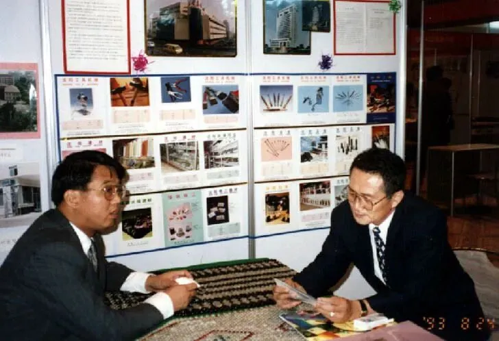 与当时沈阳市商业局下属的五金公司展位前工作人员合影