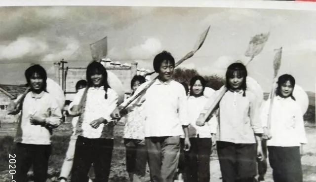 这个铁锹头有点扇形,挖沟时抬脚一踩就进土,抡起来有重量,队长在远处喊一嗓子,大家哄笑着答应,干完活把锹刃往地上一插,站成一排合影。