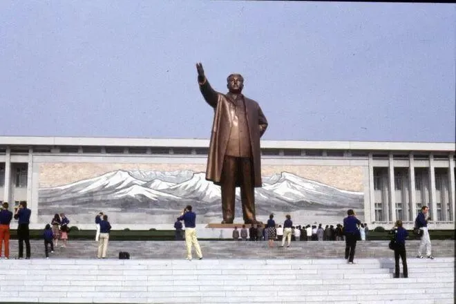 平壤巨大的金日成铜像,应该是花了不少的银子。朝鲜实行个人崇拜,整个国家到处是金日成的雕像和画像。