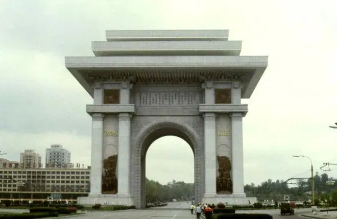 1982年4月15日金日成七十寿辰之际,十万青年突击队员用肩扛手抬的方式,在212天内完成这座思想丰碑。
