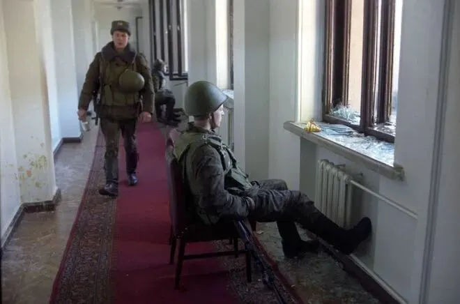 1990 年 2 月,杜尚别,在塔吉克斯坦被苏军占领期间,一名士兵凝视着窗外。