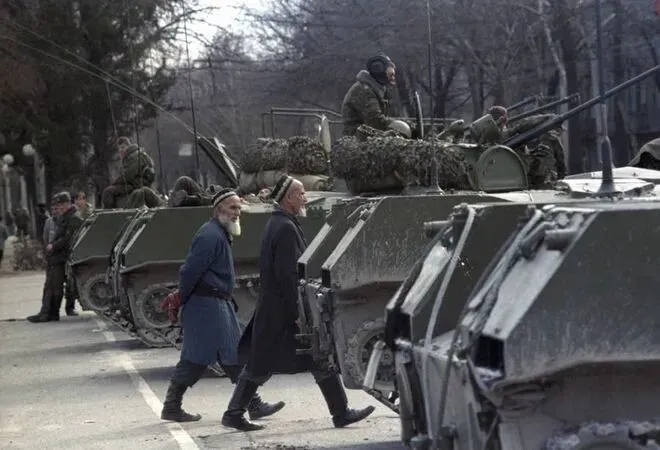 1990年2月15日,两个塔吉克男人漫不经心地走过一排坦克,他们已经习惯了杜尚别戒严令的新常态。