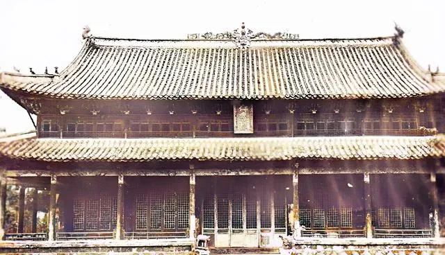 这一整排屋脊起伏的是南岳庙的正殿,重檐歇山顶一压,气口立住了,阳光斜斜照在瓦当上,像给每片瓦涂了金粉,小时候我第一次见这么长的抱厦,以为能一直走到天边。