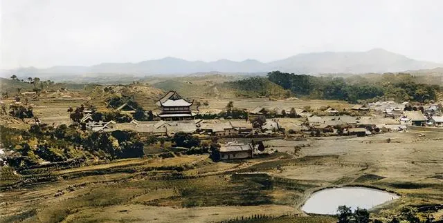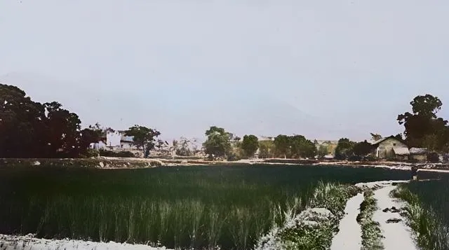 这张远眺里铺开的屋顶叫庙市一带,房屋散在田埂旁,水塘像一面镜子,老照片上看不见匆忙,只有炊烟和狗叫,妈妈说那时候赶集,买糖饼得排队,队伍拐了三个弯。