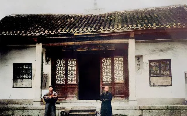 图中两位站在门前的穿长袍的人,多半是住持与香客,门扇上木格细密,光从后边透过来,影子像被剪了一刀,爷爷当年学礼的时候说过,进佛门,帽子先摘心先敬。