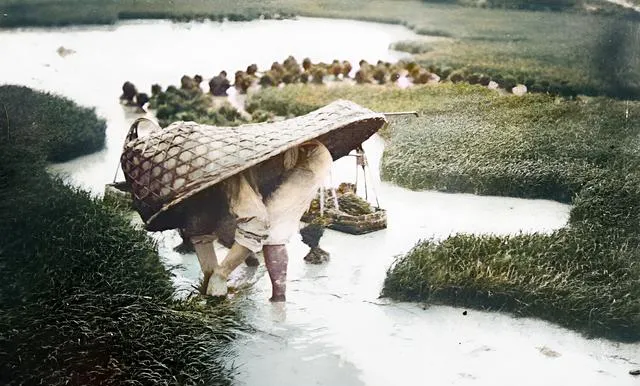 这个斗笠似的大罩子叫蓑笠斗篷,图里人正从育苗池里抬秧,弯腰踩水,泥浆顺着裤管往下坠,奶奶笑过我说,别嫌脏,这一笼秧下去就是来年的饭碗咯。