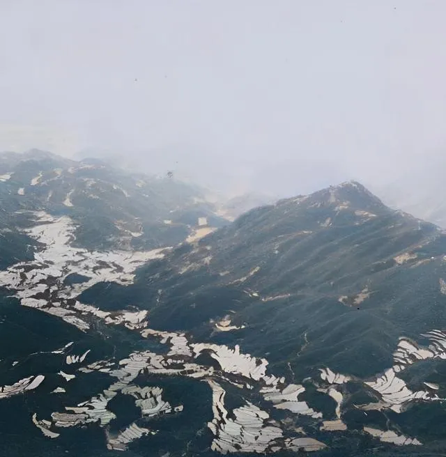 这幅像地图的纹路是山顶俯瞰的梯田和沟谷,白亮的田面一块块拼起来,像鳞片贴在山背上,我特爱这张,没人物,只有地在呼吸。