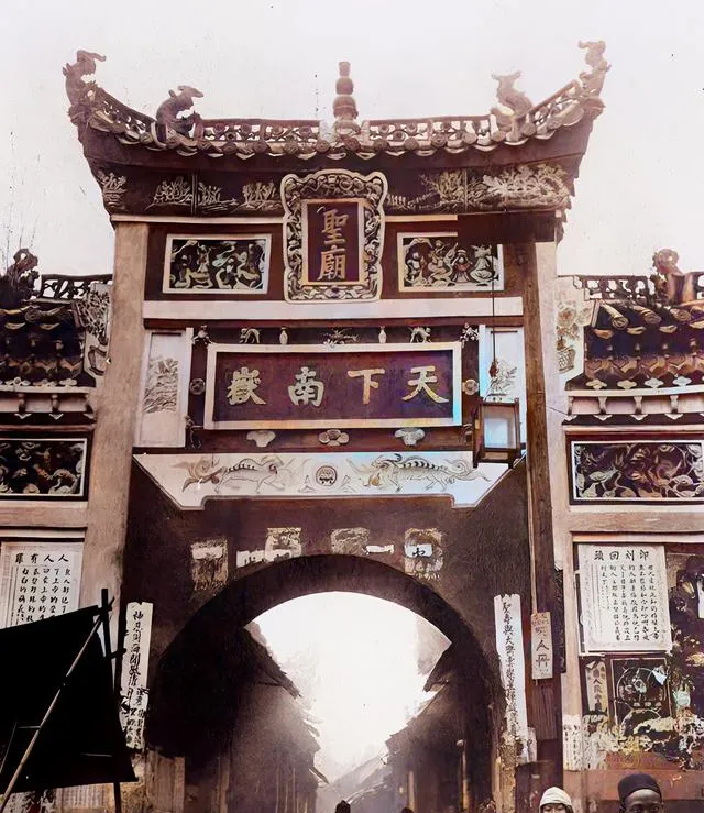 这座雕梁画栋的牌楼叫天下南岳牌楼,匾额厚重,彩绘密密铺满,站在门洞里抬头一看,全是故事,爸爸说他小时候抬头先找小神像,找着哪尊就求哪尊保个平安。
