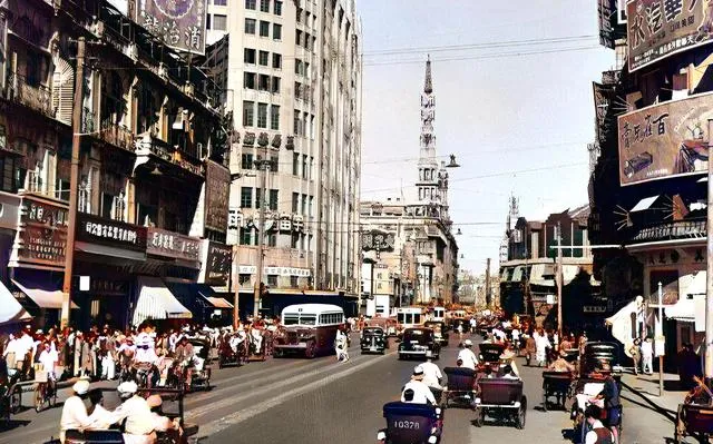 图里这条宽阔的大街叫租界马路的味道,招牌一溜儿挂到天上,黄包车、电车、汽车混在一块儿,喇叭声一路催促,不懂规矩的外地人第一次来,真能被晃花眼。