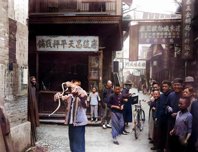 25张民国老照片:街头耍蛇男子真胆大,铁锅居然这么做出来的。