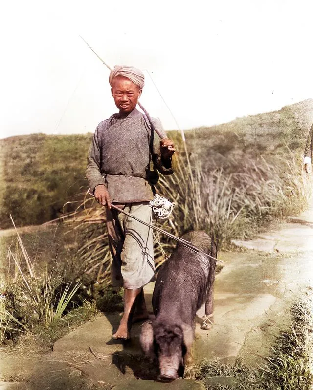 图中竹竿挑绳的叫配种郎,牵着大公猪走乡串户,蹄上还套了草鞋,山路打滑不伤脚,他自己裤腿一挽,日头下皮肤冒着盐花。