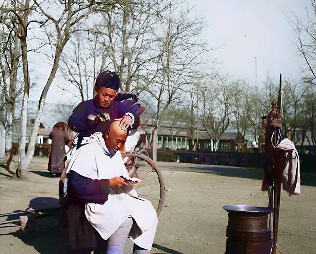 这个就是剃头挑子,木箱里剪刀剃刀一全,旁边铜盆热水冒气,客人低头看小镜子,师傅手在头皮上飞快地走,十来分钟一单,干净利索。