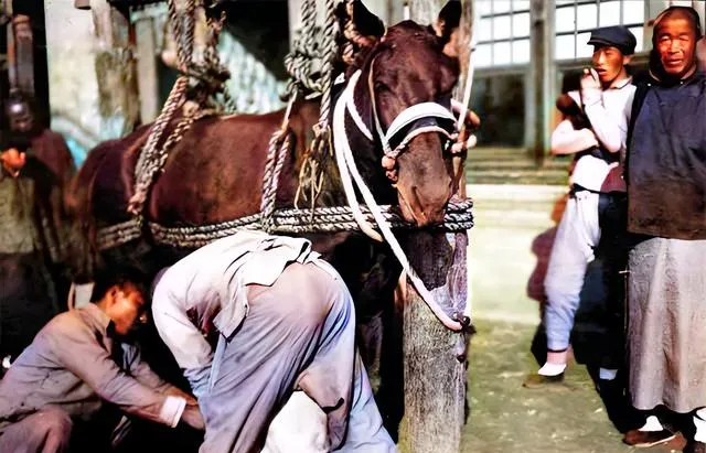 这个场面叫给马掌活,粗绳把马拴稳,师傅蹲地上拿钳子起旧掌,再把铁掌贴在蹄底,叮叮当当几下就妥了,放在今天,你看车胎店就能想个八成。