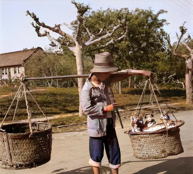 肩上扁担两头一轻一重,重的一头是空篮子,轻的一头摆的是泥塑小人,娃娃远远看见就缠着要,娘亲挑起担子走两步,说下回再买。