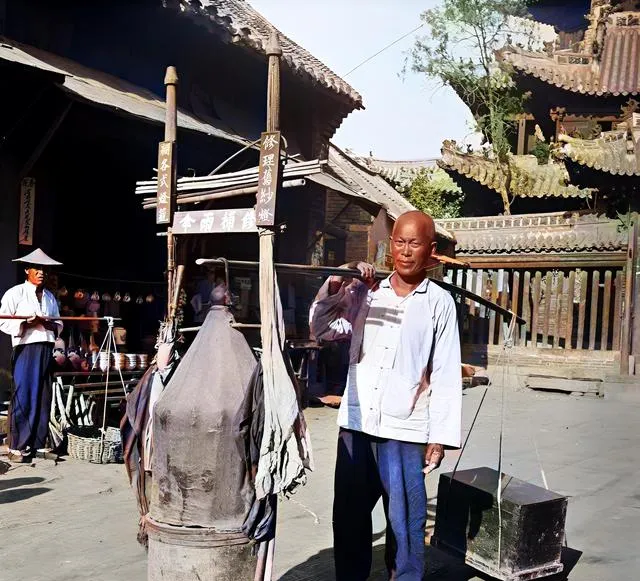这叫卖凉水的挑子,大布袋罩着水囊,左边是量器,牌子上写着“凉水两文一碗”,夏天庙前人多,挑夫肩头勒出一条深痕,也顾不上疼。
