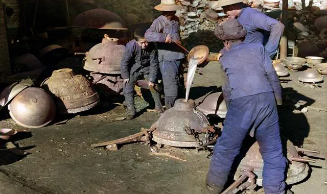图中翻滚的银白叫铁水,师傅们抬壶往砂模里倒,咕噜一声冒烟,等凉透了敲开砂壳,一个个铁锅就出来了,这活儿热得要命,裤腿都能烤得发硬,难怪现在看见一口老铁锅,心里总觉得它沉甸甸的有分量。