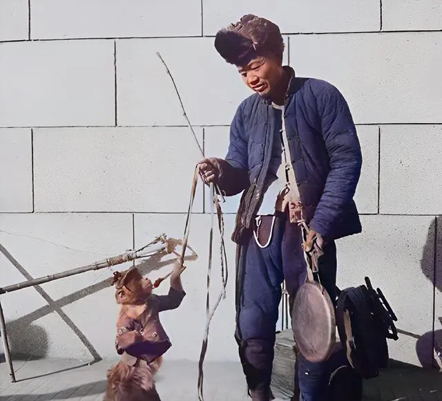 这位小姑娘胸前挂着报纸当围裙,手边油锅里的蛋散吱吱作响,脸上有股倔劲,买的人问脆不脆,她抬下巴说脆得很,旁边这位扯着细绳的叫耍猴,猴子穿件小红褂,跳起来给人作揖,围观的大人孩子笑成一片,我妈叹气说,现在城里再见不到这种江湖气了。