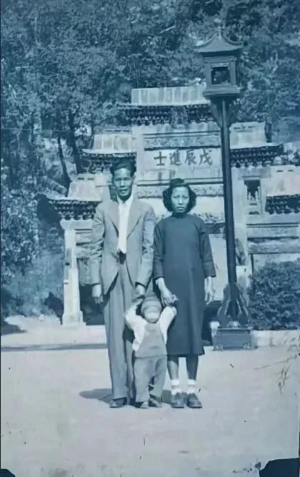 年幼的温志澄与家人在戊辰进士坊前合影(约1948)
