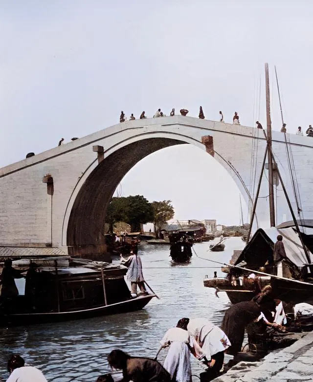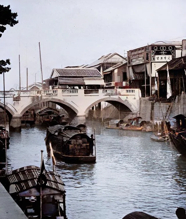 这座拱桥肚子圆,桥下挤满小船,船篷像一排黑贝壳,岸上铺子墙上刷着大字,河道是巷,也是路,谁家吆喝谁家开伙听得见,现在城市把水藏在栏杆后面,住在河沿的人少了,水也像客人了。