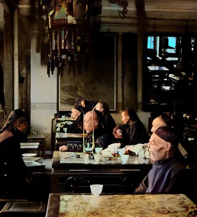 这一屋子的八仙桌靠得紧,瓷碗沿上留着茶迹,角上吊一盏宫灯,伙计端壶穿桌缝,书场那头说到紧处,听客抬眼,嗯一声,小时候我跟着大人去茶馆,最爱往壶嘴上看蒸汽,现在换成咖啡馆了,闲聊的时间照旧,杯子换成玻璃的。