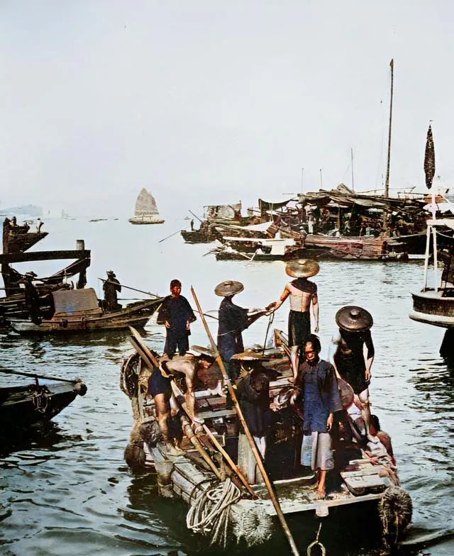 这一片船挨船的码头,青年戴着阔边草帽,长篙一点,水波就把船身拎开一寸,远处一张白帆慢慢挪,渔火的人家把饭煮在船上,浪就是门窗,如今维港边楼光直插云,海面宽了,旧时的木船味道淡了。