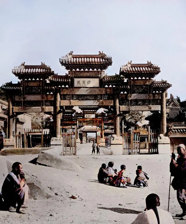 图中这座大牌楼对着高大的城门叫正阳门,匾额是满汉两种字,门洞里车辙交错,马车一辆接一辆往外窜,拉黄包车的、挑担子的在檐影底下闪过去,老北京的门脸子就是这么排场,现在来城楼拍照的人多是举手机的游客,当年的忙活可都是谋生的脚步声。
