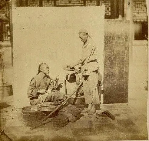 这张里的木架子像小屋,叫站笼,犯人被关在里面直挺挺站着,伸手摸不到顶,想蹲也蹲不下,天热闷到喘不上气,天冷脚底发麻,赶路时两边轿夫抬着走,谁也不跟你废话,妈妈说,老街口常见一车一车的囚车过,车轮吱呀,孩子们被大人一把拽到墙根。